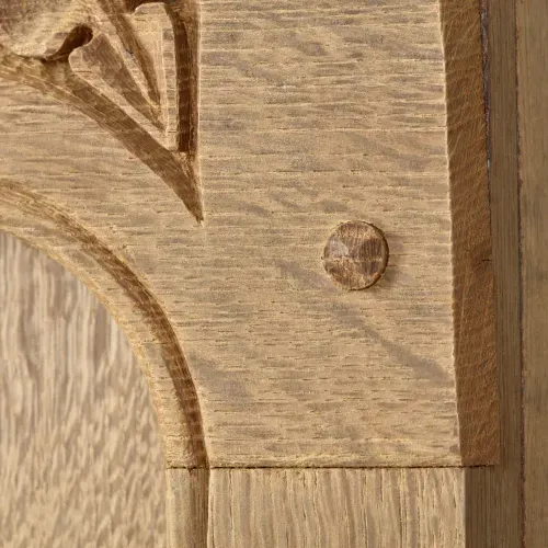 The carving on the frame is the main decorative feature of this door. Our standard carving replicates the original door at the V&A, but this can be varied and made more unique to you. The structure of the back frame also permits a small viewer window to be added.